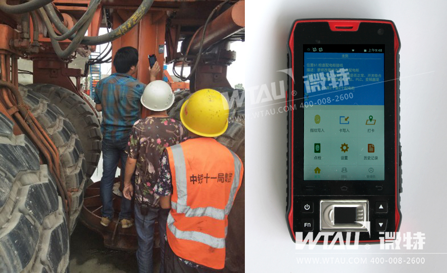 圖為微特售后服務(wù)工程師現(xiàn)場(chǎng)指導(dǎo)使用PDA點(diǎn)檢系統(tǒng)
