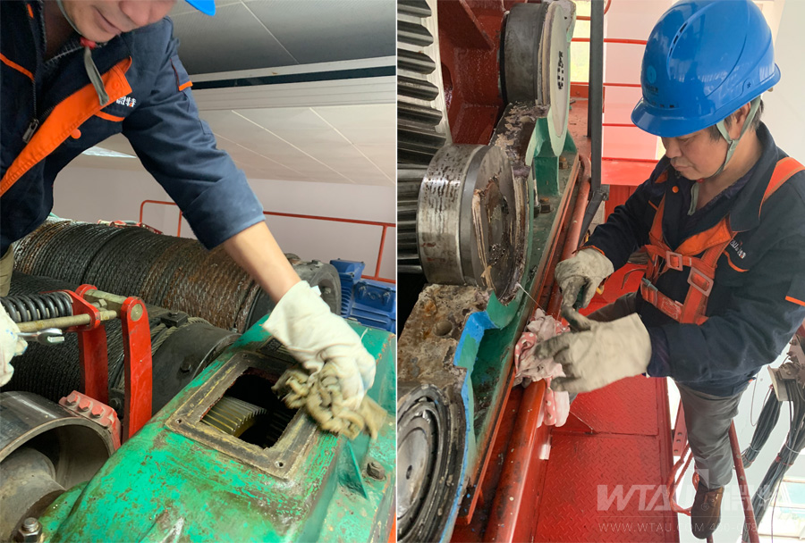 本次維護(hù)主要是對芭蕉河一級、二級站廠房橋機(jī)進(jìn)行全面檢查維護(hù)作業(yè),并針對老設(shè)備存在的安全隱患問題,提出了針對性的處理意見,電廠對我方提出的處理方案積極響應(yīng),經(jīng)過技術(shù)討論,對兩臺橋機(jī)減速箱內(nèi)老化油脂進(jìn)行全部更換、電氣回路進(jìn)行問題排查處理,加裝安全保護(hù)裝置及儀表。