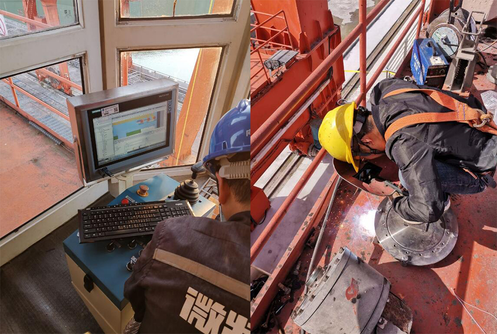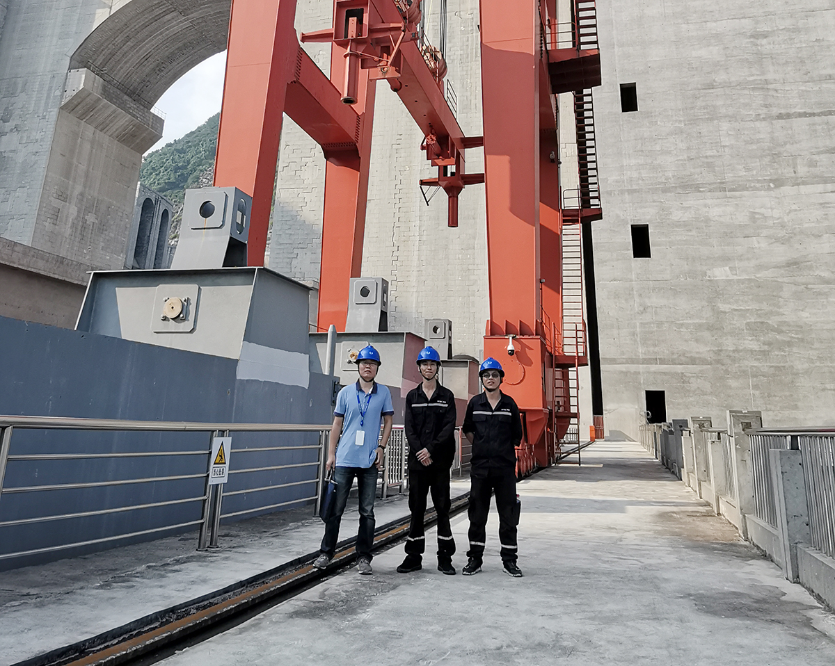 施工過程中,由于尾水門機抓梁不能落到地上,安裝過程中全程都是高空作業(yè),這無疑也加大了施工難度。而且,安裝期內(nèi)恰逢當?shù)囟嘤晏鞖?,為了不延誤工期,售后工程師們時常要冒雨施工。雖然過程中困難較多,但均被一一克服解決,項目有序推進。