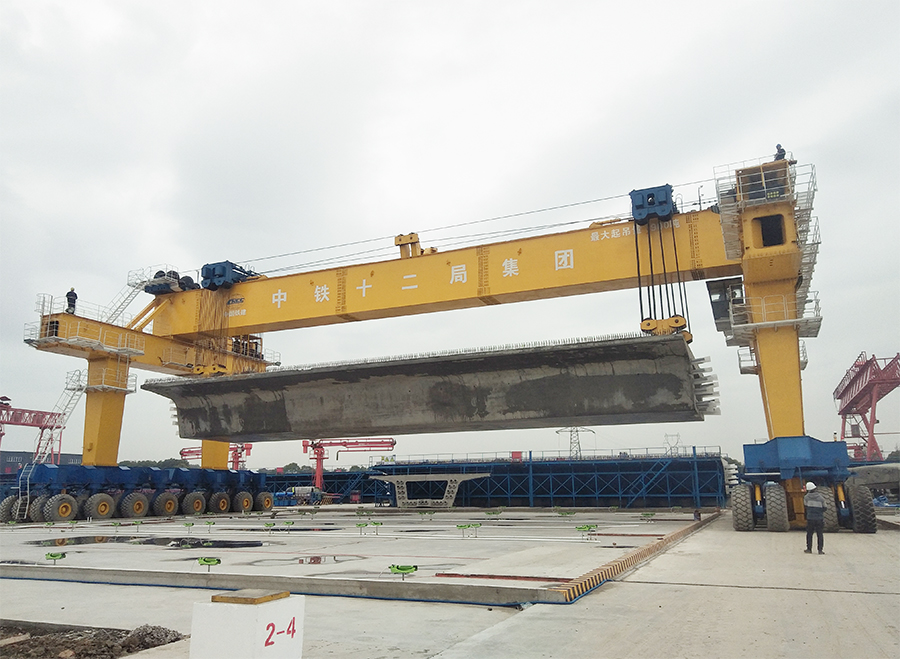 江陰制梁場(chǎng)制架箱梁785孔;江陰鋪軌基地全線鋪新軌604.41鋪軌公里,鋪道岔123組;江陰站站房9370.94平方米。每次吊裝及運(yùn)輸再到高架橋的鋪架都需要相應(yīng)的設(shè)備,最初就需要大型提梁機(jī)將重達(dá)800噸的箱梁提到運(yùn)梁車上,然后再運(yùn)到橋墩通過(guò)架橋設(shè)備鋪架到橋墩上。