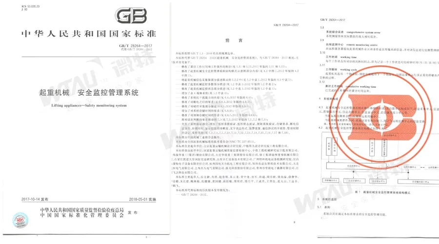 根據(jù)2010年7月國務(wù)院就提出強(qiáng)制推行大型起重機(jī)安裝監(jiān)控管理系統(tǒng)的通知。2012年7月中華人民共和國國家質(zhì)量監(jiān)督檢驗(yàn)檢疫總局、中國國家標(biāo)準(zhǔn)化管理委員會發(fā)布GB/T 28264-2012《起重機(jī)械 安全監(jiān)控管理系統(tǒng)》。