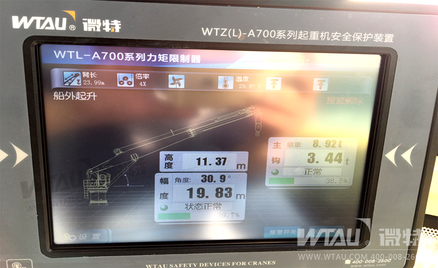 上圖為微特電子配備的WTL-A700型力矩限制器顯示儀,該型號儀表采用8寸TFT LCD觸摸屏,SG高耐蝕性熱鍍層鋼板機身,鋁合金面板;IP65防水性,最大800X600(V)像素;可動態(tài)仿真的顯示當前重量、幅度、角度、額重、工況等參數。并可外接PLC,智能儀表,板卡,模塊,變頻器等工業(yè)自動化設備。顯示儀自帶8M內存,并可擴展外部記錄SD卡。