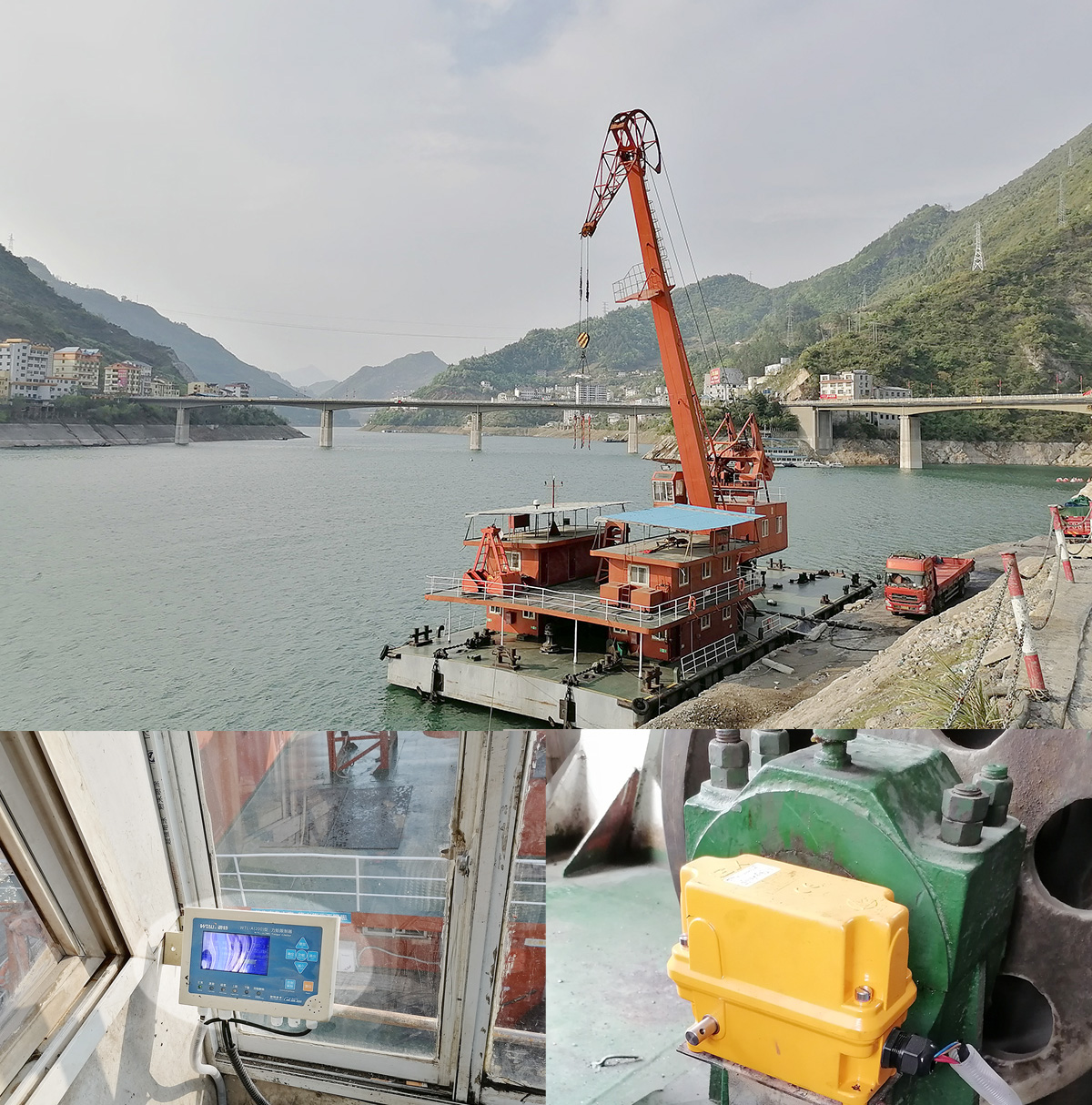 原有的浮吊在起升吊重及幅度上都只有機械式的限位裝置,操作人員沒有直觀的數(shù)字及明確的報警提示。在與微特進行詳細(xì)的需求溝通后,微特迅速組織技術(shù)人員驅(qū)車到往現(xiàn)場,為浮吊加裝了重量、角度、高度機械限位裝置。