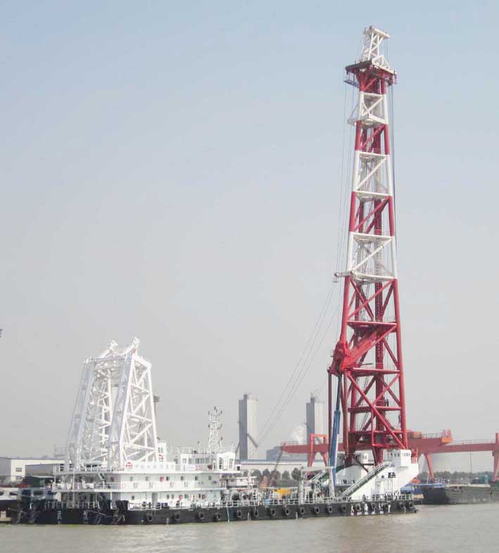 與國內(nèi)其他打樁船相比,“海威951”打樁船有三大特點(diǎn):一是該船集打樁和吊裝為一體,一次最大抬吊重240噸,還可以做-27°到﹢25°的變幅;二是可插打18.5°的斜樁,其樁基施工的仰俯角度在國內(nèi)為最大;三是95米高的樁架可進(jìn)行三次變幅折疊,變幅后的樁架距水面高度僅有25.4米,可以抵達(dá)長江中下游的任何施工地。