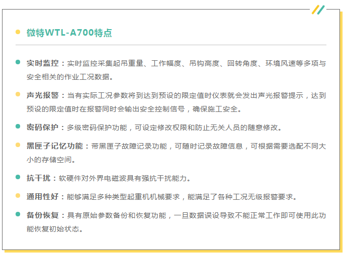 此次為廣東中藝固定式門座機(jī)配備的新WTL-A700力矩限制器就是微特主要針對(duì)固定式門座機(jī)研發(fā),生產(chǎn)的一款實(shí)用性非常強(qiáng)的儀表,采用觸摸屏屏顯示,用于四路以下重量信號(hào)和一路角度一路風(fēng)速信號(hào)的監(jiān)控。