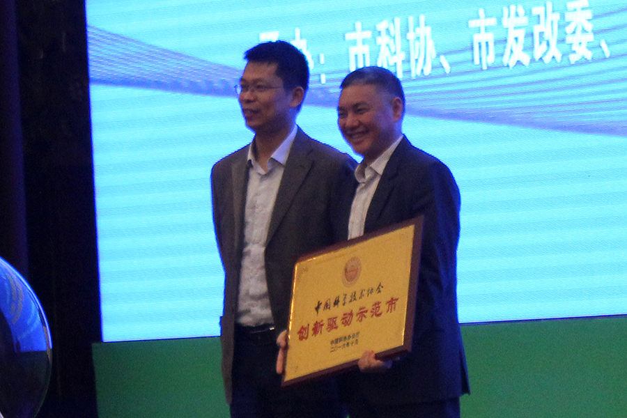 中國科協(xié)“創(chuàng)新驅(qū)動示范市”授牌儀式上,中國科協(xié)學(xué)會服務(wù)中心副主任徐強(左)授牌,副市長王應(yīng)華(右)接牌。