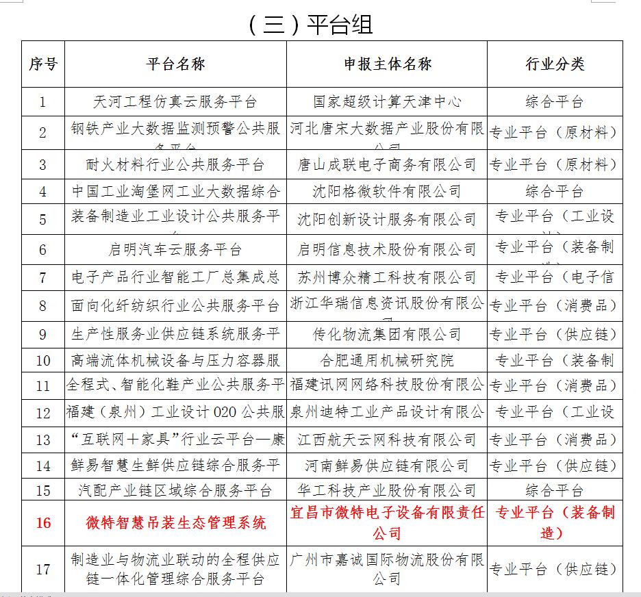 工信部官網(wǎng)公示入選的2017年服務(wù)型制造示范企業(yè)(項(xiàng)目、平臺(tái))名單中,全國首批入選服務(wù)型制造示范企業(yè)有30家,示范項(xiàng)目60家,示范平臺(tái)30家。“微特智慧吊裝生態(tài)管理系統(tǒng)”成功入選服務(wù)型制造示范平臺(tái)。