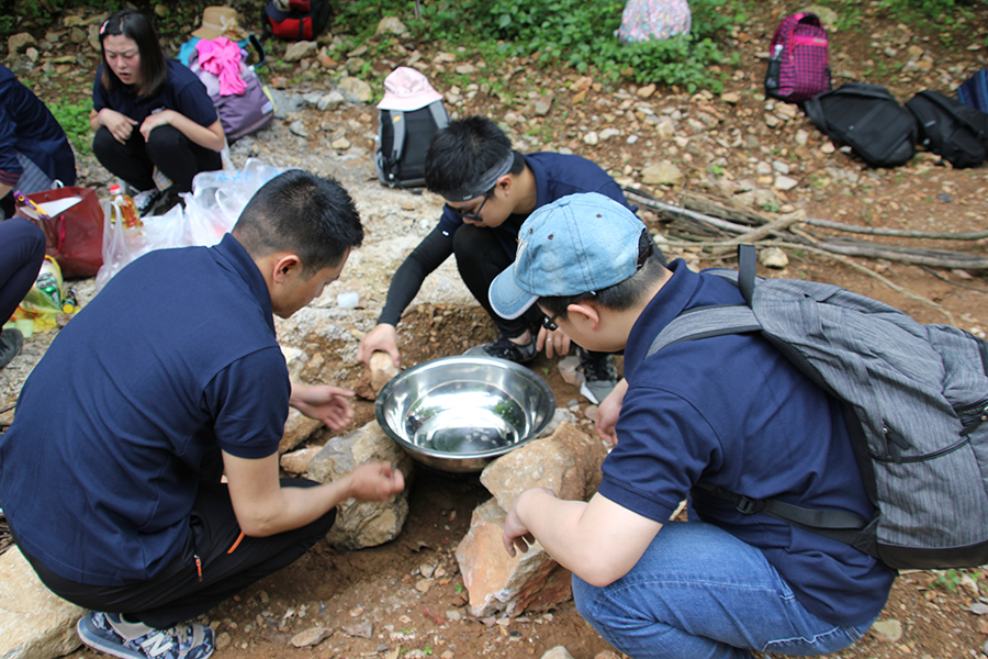 經過半天的登山式行軍,中午,我們來到山谷中一處較平坦地地方,各隊開始分工埋鍋造飯,相互配合做中餐。