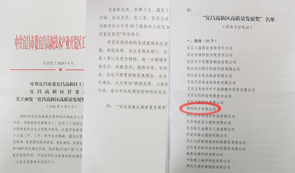 近日,微特技術(shù)有限公司榮獲由宜昌高新區(qū)黨工委、管委會(huì)授予的2019年度宜昌高新區(qū)“高質(zhì)量發(fā)展獎(jiǎng)”。
