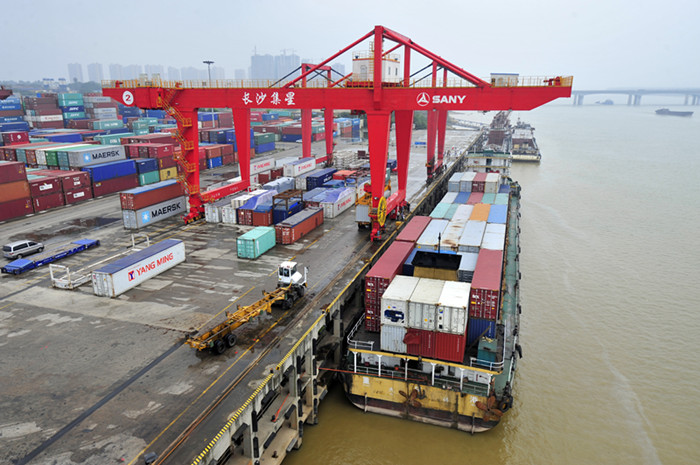 5日下午,一艘裝載著350標(biāo)箱的7000噸級(jí)集裝箱船緩緩靠泊長沙新港集裝箱碼頭。這是長沙新港通航史上的最大噸級(jí)船舶,也是長沙至上海內(nèi)支線上最大的船舶。