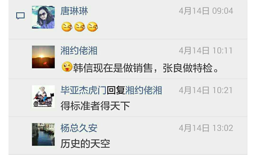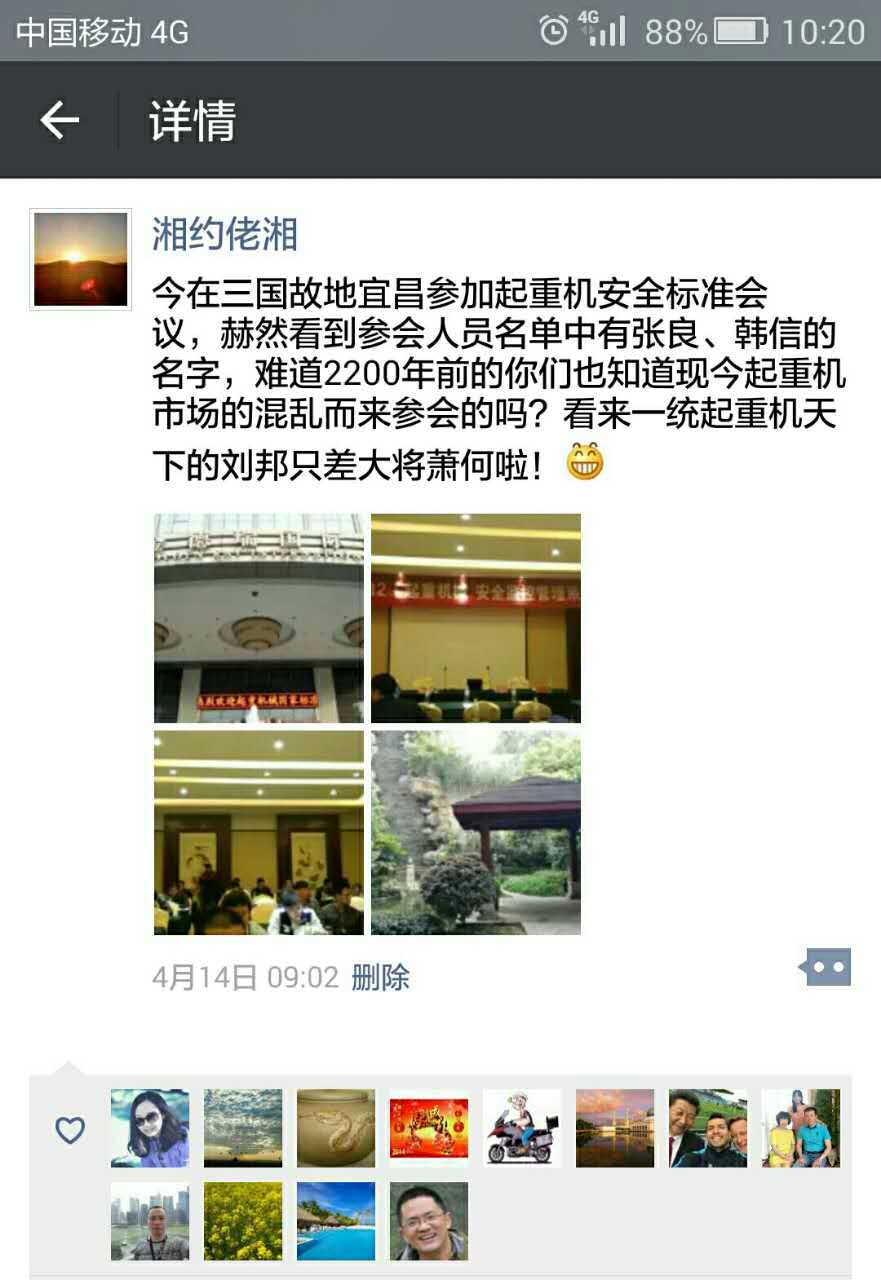 為了紀念這一“歷史性“時刻,天津起重的唐總在其4月13日的微信上也發(fā)表了感想,原文摘抄如下:“今在三國故地宜昌參加起重機安全標(biāo)準(zhǔn)會議,赫然看到參會人員名單中有張良、韓信的名字,難道2200年前的你們也知道現(xiàn)今起重機市場的混亂而來參會的嗎?看來一統(tǒng)起重機天下的劉邦只差大將蕭何啦!”唐總此文一出,立馬引來圍觀,點贊者、好奇者、祝福者引爆其朋友圈,著實火了一把,且看微信截圖。