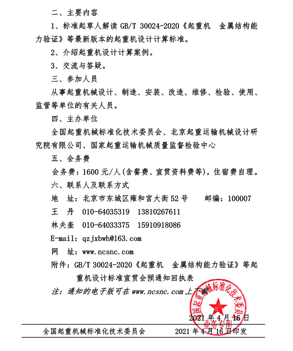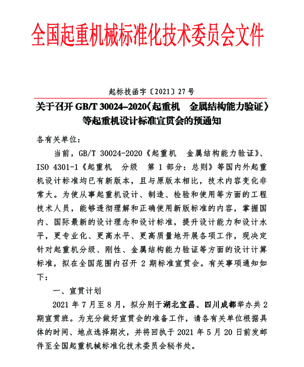 為使從事起重機(jī)設(shè)計、制造、檢驗和使用等方面的工程技術(shù)人員,能夠透徹理解和正確使用新版標(biāo)準(zhǔn)的內(nèi)容,掌握國內(nèi)、國際最新的設(shè)計理念和設(shè)計標(biāo)準(zhǔn),提升設(shè)計能力和設(shè)計水平,更專業(yè)化、更高水平、更高質(zhì)量地開展各項工作,全國起重機(jī)械標(biāo)準(zhǔn)化技術(shù)委員會針對起重機(jī)分級、剛性、金屬結(jié)構(gòu)能力驗證等方面的設(shè)計計算標(biāo)準(zhǔn),將于2021年7月至8月分別在湖北宜昌、四川成都召開2期標(biāo)準(zhǔn)宣貫會。