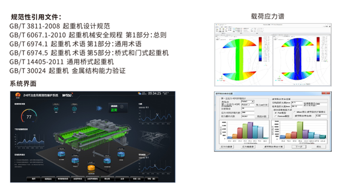 WT-SMS-YL03鑄造起重機(jī)應(yīng)力在線監(jiān)測系統(tǒng),是依據(jù)鑄造起重機(jī)報廢標(biāo)準(zhǔn)開發(fā)制造的能實時監(jiān)測、顯示主梁在各種載荷下的應(yīng)力數(shù)據(jù),根據(jù)設(shè)計安全范圍給出橋機(jī)主梁疲勞結(jié)構(gòu)應(yīng)力過載超范圍預(yù)警提示,系統(tǒng)能存儲、導(dǎo)出數(shù)據(jù),可以對監(jiān)測的數(shù)據(jù)做趨勢分析,結(jié)合有限元分析和載荷應(yīng)力譜對主梁的健康度做評測。