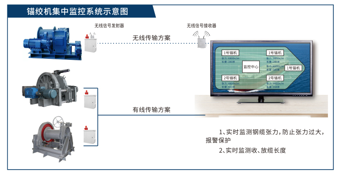 大型工程船、浮吊、油輪、躉船、錨地等工程設(shè)施在施工、靠泊、牽引、??繜o人值守時,會采用絞纜機張拉纜繩就位、固定,絞纜機牽引力與剎車制動力距需要實時監(jiān)測,并在過載時發(fā)出明顯的警報、可以在超力矩時有計劃的松閘釋放部分力矩,保障纜繩、錨機、船舶不出事故。