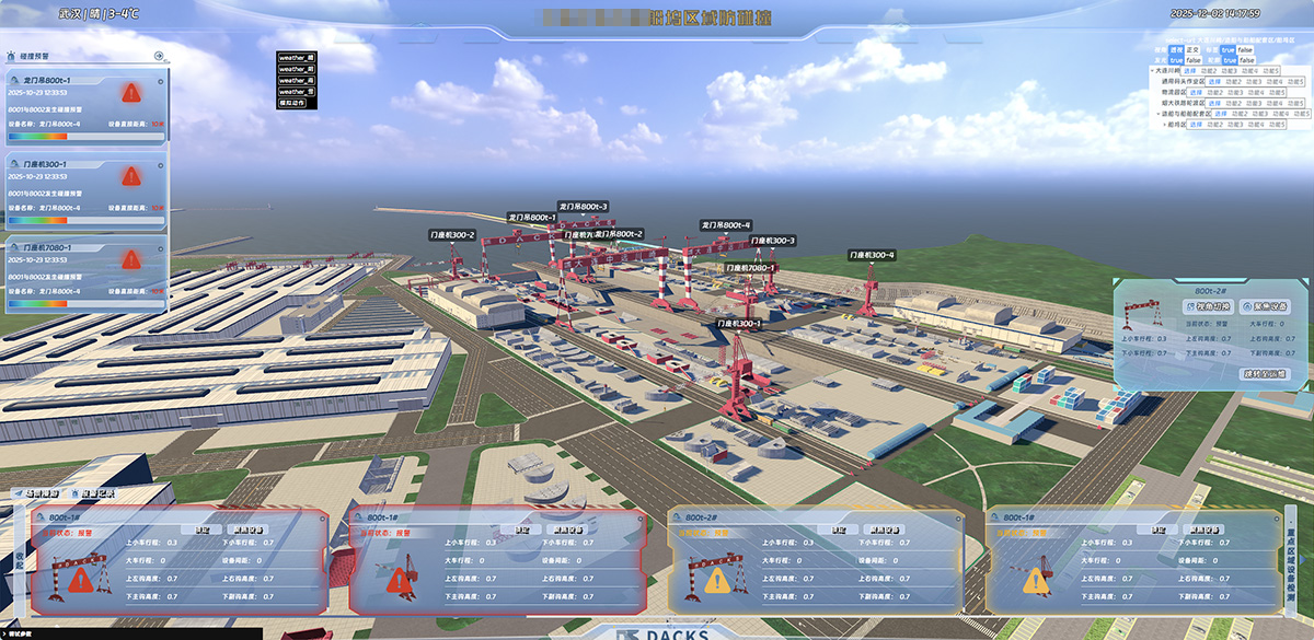 需要做集中集控管理的用戶,系統(tǒng)還需配置遠程三維監(jiān)控平臺。將船塢組裝場地進行三維場景模型處理,且需保證關鍵位置(如軌道位置關系等設備運行活動范圍)與設備產(chǎn)生空間關系的區(qū)域,按照1:1精確建模,并展示上做突出處理,保證能準確、清晰地反映設備當前工況。