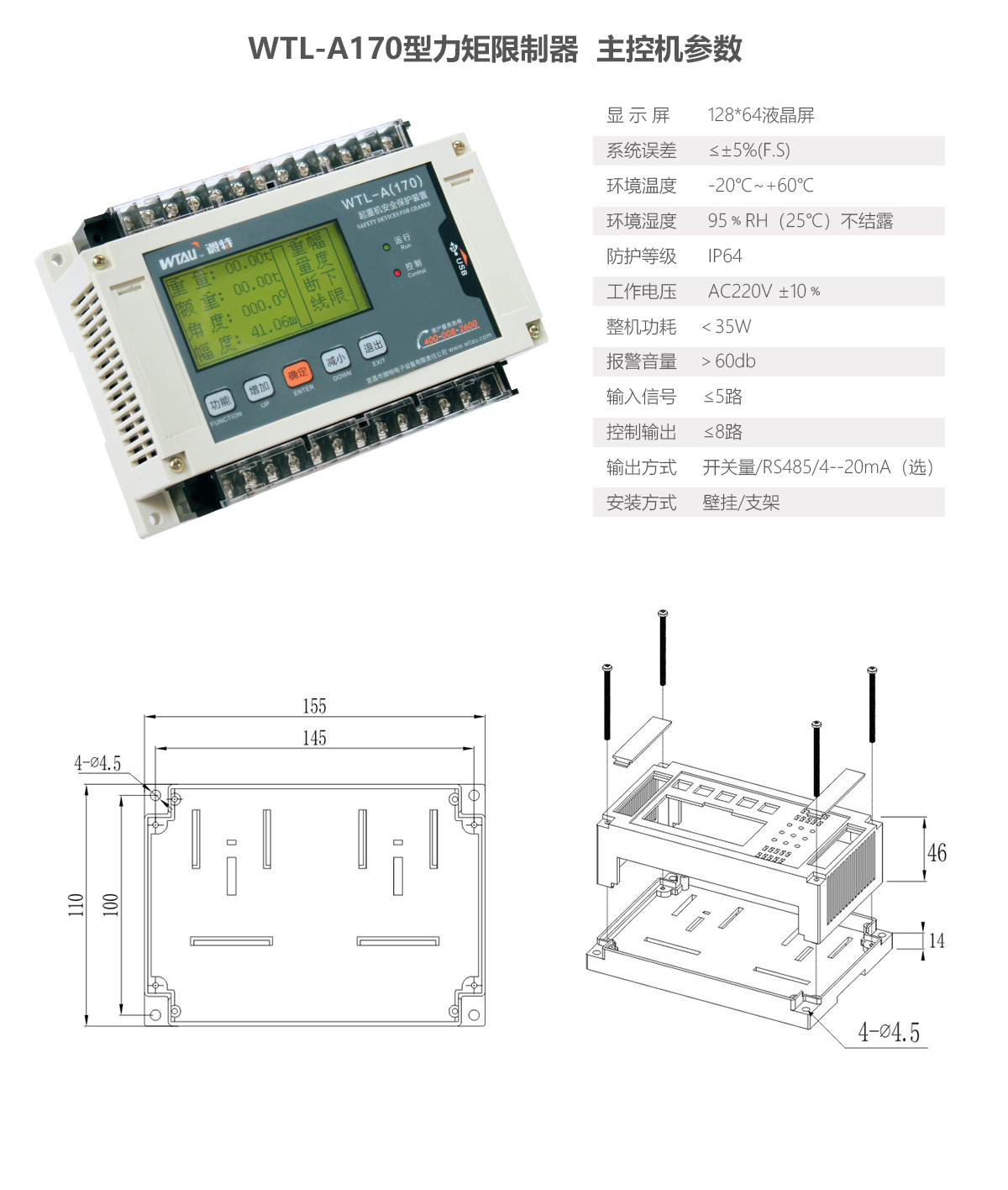 WTL-A170力矩限制器產(chǎn)品特別適用于用于雙搖臂抱桿、汽車吊、港口門座式起重機(鷹嘴吊)、履帶吊、固定吊、輪胎吊、桅桿吊等監(jiān)控信號較多的起重設(shè)備。