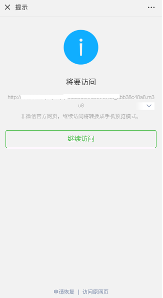 騰訊云放回的m3u8地址是一個直播的視頻流地址,直接播放會在微信頁面有一個【繼續(xù)訪問】的頁面提示;
