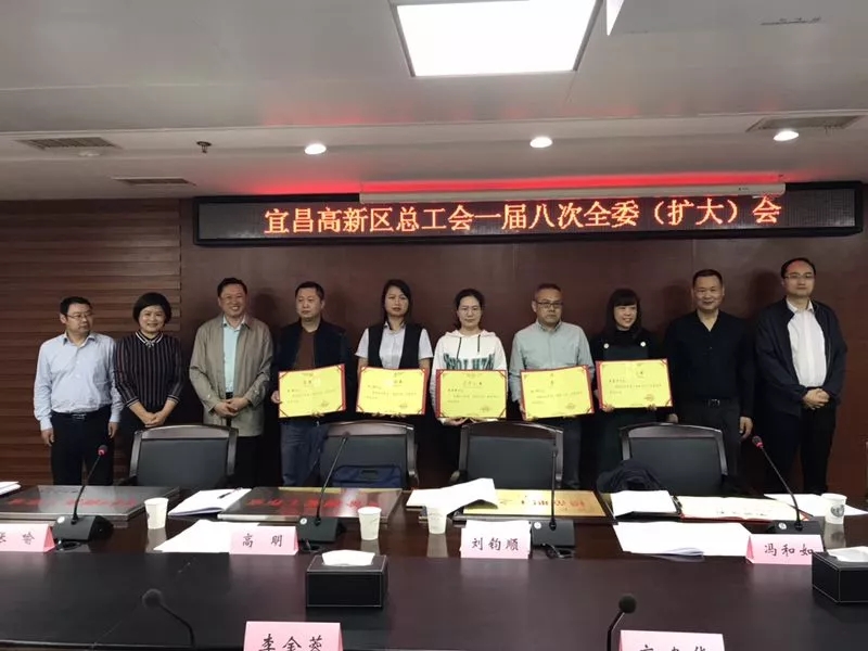 ▲4月25日,宜昌高新區(qū)總工會召開一屆八次全委(擴大)會議,微特技術(shù)公司員工劉艷喜獲2018年度“高新工匠”榮譽稱號。(上圖左五)