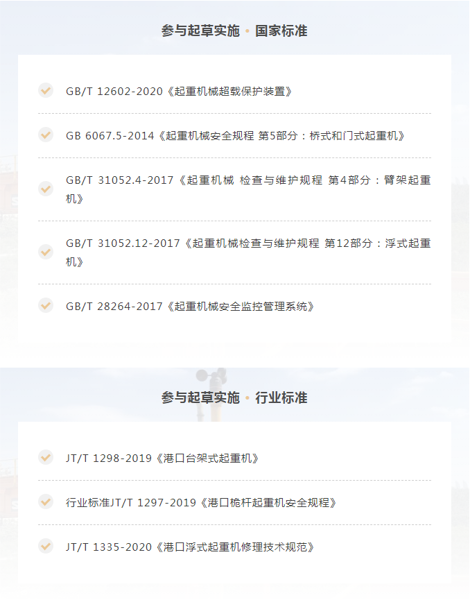 2019年9月微特當(dāng)選全國起重機(jī)標(biāo)委會(huì)臂架分會(huì)委員會(huì)委員。2020年10月1日由微特牽頭起草的國家標(biāo)準(zhǔn)GB/T 12602-2020《起重機(jī)械超載保護(hù)裝置》正式實(shí)施,這也是微特參與起草并發(fā)布實(shí)施的第5項(xiàng)國家標(biāo)準(zhǔn)。截止到目前微特先后參與了20多項(xiàng)國家標(biāo)準(zhǔn)的起草,其中5項(xiàng)國家標(biāo)準(zhǔn)及3項(xiàng)行業(yè)標(biāo)準(zhǔn)已頒布實(shí)施。