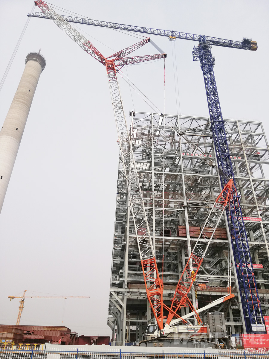山東棗莊陳田礦電站主體結(jié)構(gòu)正在緊張建設(shè)中,鋼結(jié)構(gòu)是其主要組成部分,其中大型箱板重達(dá)上百噸,而圖中大型600T履帶吊起到關(guān)鍵作用。最大600t的起重量,100多米的最大起升高度,足以看出這是個大家伙。
