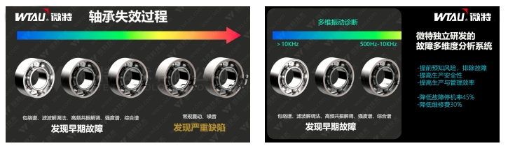 目前市場上,一般通過常規(guī)振動(dòng)、噪音,才能發(fā)現(xiàn)軸承嚴(yán)重缺陷。微特獨(dú)立研發(fā)的故障多維度分析系統(tǒng),通過包絡(luò)譜、濾波解調(diào)法、高頻共振解調(diào)、強(qiáng)度譜、綜合譜,能在早期就發(fā)現(xiàn)軸承故障。能有效地提高生產(chǎn)安全性、提高生產(chǎn)與管理效率、降低故障停機(jī)率45%、降低維修費(fèi)30%,幫助企業(yè)降低生產(chǎn)、管理、運(yùn)營等成本,提升利潤。